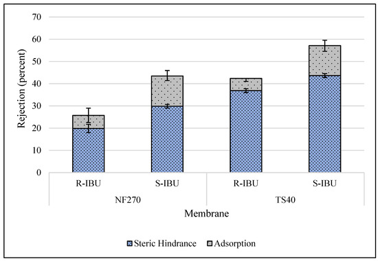 Rejection of R- and S-IBU at a feed water pH of 4.0 units (initial IBU concentration 400 µg/L, water flux 42.4 L/m2h, temperature 20 ± 1 °C). Error bars represent minimum and maximum values from triplicate analysis.