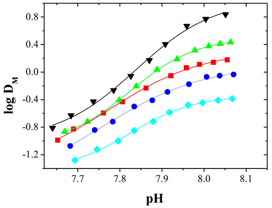 where: C0,M and CM denote analytical metal ion concentrations in the aqueous phase before and after the extraction equilibrium was achieved, respectively. For each case, DM was calculated from the Formula (3).