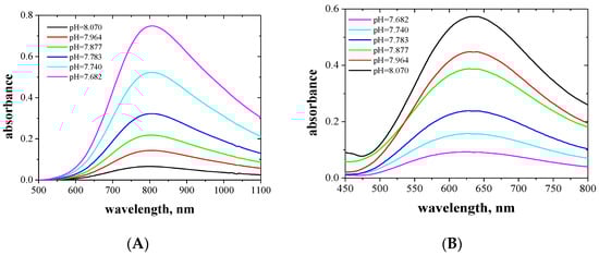 The Cu(II) complexes with EDAB-acac are blue and deep-blue in the aqueous and organic phases, respectively. In the organic phase, the maximum absorption increases with increasing ligand concentration. The absorption maxima for the aqueous and organic phases occur at wavelengths of 805 (Figure 3A) and 635 nm (Figure 3B), respectively. One maximum absorption testifies to the formation of a single complex with octahedral symmetry. A similar phenomenon was observed in the works [49,50,51,52].
