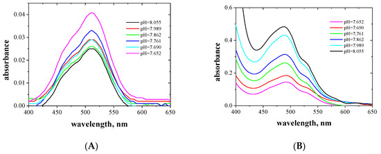 The Co(II) complexes with EDAB-acac are pink and orange in the aqueous and organic phases, respectively. For the aqueous phase, the maximum absorption occurs at a wavelength of 509 nm. In the organic phase, the maximum absorption occurs at a wavelength of 489 nm, however, as the ligand concentration increases, a second peak appears at a wavelength of 530 nm. In the case of Co (II), there are two maximum absorptions, which prove the formation of two types of complexes. Maximum at a wavelength of approx. 480 corresponds to octahedral complexes, while the band at higher wavelengths approx. 530 corresponds to tetrahedral complexes. Changes in the symmetry of the coordination sphere have been observed in the case of Co (II) complexes with alikoimidazoles [53] and are also described in [51] and also e.g., in [54,55].