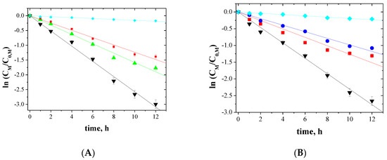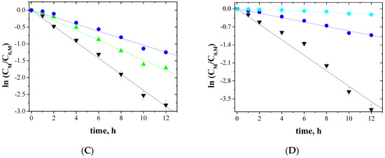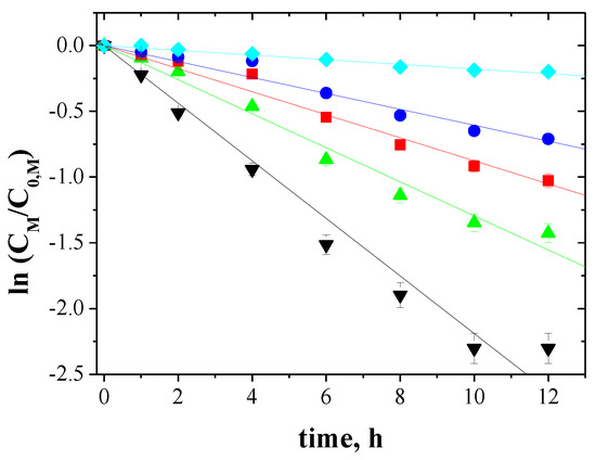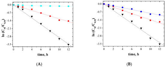 The relationship between ln(CM/C0,M) and the time of metal ions transport across PIMs for 5-, 4- and 3-component mixtures is shown in Figure 5, Figure 6 and Figure 7, respectively.