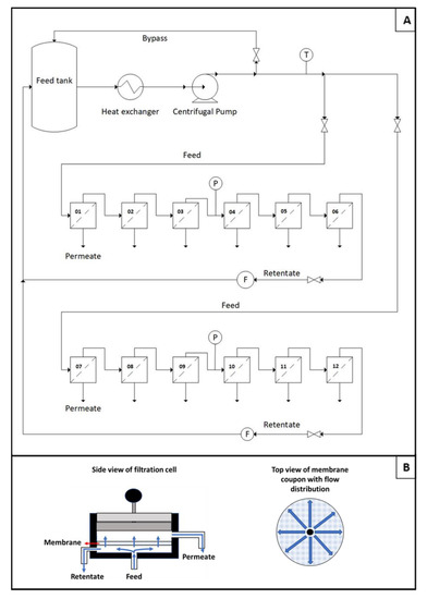 All filtration tests were performed using an in-house custom-built flat sheet crossflow filtration membrane coupon tester (CT), as the one depicted in Figure 1. The equipment consists of 12 filtration cells, arranged in two benches of 6 cells each. The cells fit circular membrane coupons of 5.8 cm diameter (area of 26.55 cm2) and the permeate can be individually collected in each cell. The filtration cells are arranged in a series configuration (feed originates from the retentate of the upstream adjacent cell), but due to the very small recovery rate, a change in feed concentration between the first and last cells is deemed negligible.
