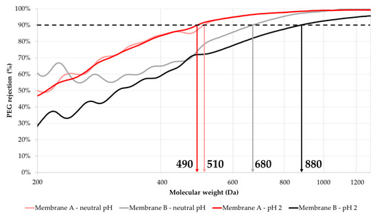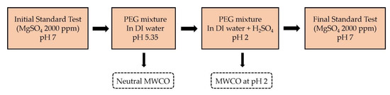 The implementation of the MWCO determination experiments is presented in Figure 2. It shows the series of filtration tests performed to obtain the MWCO at pH 2. The first step consisted in a standard test with MgSO4 2000 ppm, using 6 coupons of Membrane A and 6 coupons of Membrane B in the CT equipment. Then, the CT was cleaned, and a new feed was prepared in the 60 L tank, consisting of DI water and a mixture of PEGs (200/300/400/600/1000/2000/3000 Da), with a concentration of 1 g/L of each PEG size. The spontaneous pH arising from the dissolution of the PEGs in DI water was 5.35 ± 0.05, as no NaOH was added to avoid the presence of ions that could potentially interfere with the rejection behavior of PEGs. The crossflow filtration test of this solution was performed at standard conditions, and samples of feed and permeates were collected to assess the MWCO.