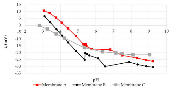 Streaming potential measurements were performed on each membrane using a SurPASS system (Anton Paar, Graz, Austria) with an adjustable gap cell and KCl 1 mmol/L as electrolyte. pH within the interval 3–9 was adjusted by addition of HCl and NaOH. The zeta potential was calculated through the Smoluchowski equation.