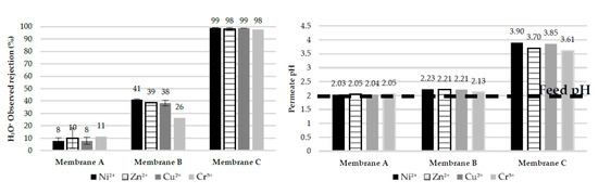 The rejection performance of the hereby studied pH-stable NF membranes shows that they cannot be used as a stand-alone process to treat EPWW if the goal is to obtain a permeate that meets the discharge limits for heavy metals. For such a purpose, hybrid processes or RO should be applied. However, this drawback could be offset by the enhanced acid recovery of which Membrane A is capable. This is an interesting feature, which can be utilized to improve the process economy and sustainability, as the purified acidic permeate could be recycled into the process, thus reducing the consumption of fresh acid and closing the loop of the acidic permeate.