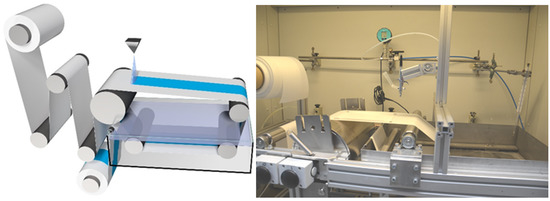 Schematic presentation of the membrane production process with three different spraying techniques combined with a membrane casting machine including a non-solvent bath (left) and spray collector (right).