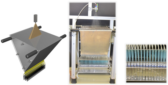 Schematic view (left) and image (center, right) of an in–house spray collector. Spray is collected in 66 chambers, each of 0.47 cm width; 31 cm in total. The spraying nozzle was fixed on an aluminium profile rack (Rose + Krieger GmbH; Minden, Germany) at a distance of 17.5 cm. Testing tubes were arranged in three rows.