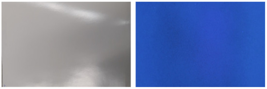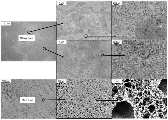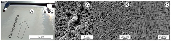 When a BCP solution is sprayed with an airbrush pistol combined with our casting machine working continuously below 5 cm·s−1, strong wavemarks can occur on the membrane, that break the membrane surface after drying since the BCP membrane is very thin. On the other hand, increasing the casting speed to avoid wavemarks and keeping the evaporation time between 5–10 s led to insufficient amount of BCP on the surface of the support membrane and inhomogeneity as shown in Figure 5. Both shiny and matt areas occur as membrane surfaces, with the former making up the majority of the area. These parts show mostly hexagonally arranged pores that can be open or closed, but also disordered parts without any pores. The matt part does not show any ordered pore structure (Figure 5, bottom).