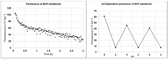 Permeance of a BCP membrane made from PS83-b-P4VP1788 solution in dioxane sprayed with airbrush on a PVDF support using a membrane casting machine (left) and pH-dependent permeance of the same membrane (right).