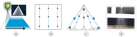 The spray pattern is still influenced by many aspects, like the nozzle geometry, applied pressure, liquid viscosity, surface tension, temperature of the liquid and the spraying angle. Additionally, the droplet velocity quickly decreases after complete spray formation due to friction forces depending on its droplet sizes and shapes leading to fog- or rain-like sprays. Figure 7b depicts a homogenous ideal spray in frontal plane (medial view). Dashed lines mark droplet flight path. In real spray, the droplet size differs over the width (Figure 7c,d) whereas at the edges the spray is stronger with bigger droplets due to the geometry of the nozzle orifice. The droplet speeds and consequently evaporation of solvent is also not the same over flight time at different positions (Figure 7c).