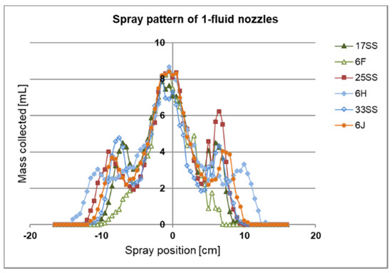1-Fluid-nozzles spraying pattern. The spraying pattern along the y-axis was measured with a spray collector. The x-axis shows the mass distribution of the spray collected in at least 66 testing tubes at different positions. The pressure was set to p(L) = 2.5 bar with a distance of d(NS) = 17.5 cm. The humidity was 44%, and room temperature was 21.6 °C.