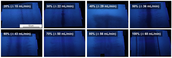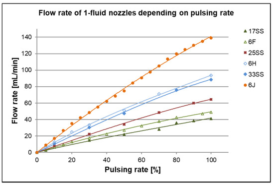 As expected, the flow rates increase with increasing size of the equivalent orifice of the nozzles and with the pulsing rate. Generally, the flow rate increases almost linearly with increasing pulsing rate. There is only a little reduction of the slope of flow rate vs. pulsing rate for pulsing rates between 80%–100%. The equivalent orifices of the nozzles 6F and 17SS, respectively 6H and 33SS, have the same size by manufacturer information (Table 1) which means, the flow rate should be the same. As shown in Figure 9, we found a deviation of ~16% from 17SS to 6F and ~5% from 33SS to 6H for the mass flow without pulsing (equates to 100% pulsing rate), which indicates the limits of precision of very small spraying nozzles.