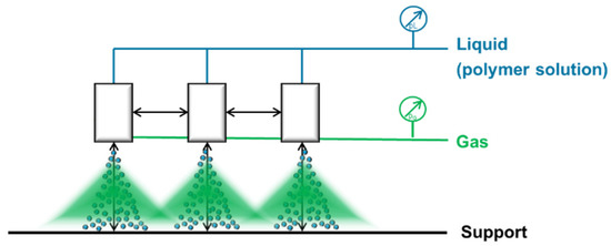 In order to upscale the preparation of thin isoporous block copolymer membranes by spray coating, our in-house designed casting machine used for general membrane casting via SNIPS was adapted to a spray coating device. An airbrush pistol or a spraying device was attached perpendicular to the support as shown in Figure 2. The spraying device and its controller were purchased from Spraying Systems GmbH (Hamburg, Germany), connectors and pipes from Swagelok Comp. (Solon, OH, USA), pressure valves from Festo SE & Co. KG (Esslingen, Germany) and pressure measurement devices LEO3 from Keller AG (Winterthur, Switzerland). The spraying device consists of three parts: the automatic spraying nozzle, which can be pulsed by opening and closing the spraying nozzle with an electromagnetic plunger up to 10,000 times per minute, a controller device which adjusts the speed of the plunger, and the exchangeable spraying nozzle-tips (head of spraying nozzle), which are responsible for the different spray patterns-, angle- and flow rates.
