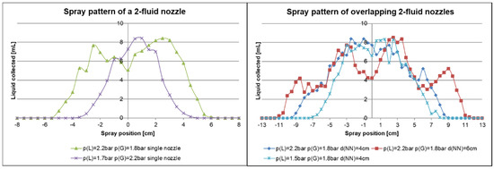 Spray pattern of a 2-fluid nozzle using different liquid pressure, p(L), and gas pressure, p(G), (left); Spray pattern of two 2-fluid nozzles overlapped using different pressures and distances of the nozzles, d(NN), (right). The spraying pattern along the y-axis was measured with a spray collector. Water was used as the liquid and the nozzle to support distance was d(NS) = 15 cm.