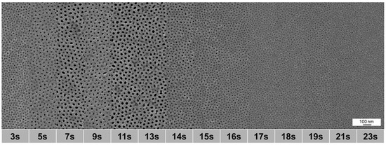 As the morphology of the membranes depends on the evaporation time of the cast block copolymer solutions before precipitation, we investigated different evaporation times from 3 to 23 s. Figure 15 shows that the evaporation time window for membranes with open pores is between 7 s and 14 s which fits to previous results [9,23]. The medium pore diameter ranges from 17.8 nm after 7 s to 19.8 nm after 11 s and decreasing again to 18.4 nm at 13 s of evaporation time in this region. After 11 s also the highest porosity of 10.9% was found. Compared to the preparation via airbrush including the casting machine or via 1-fluid nozzle, the structure appears homogeneous without defects.