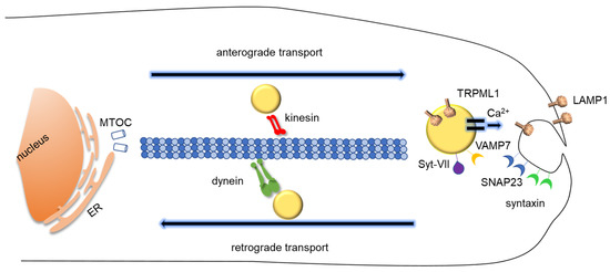Most lysosomes are localized around the nucleus and the microtubule-organizing centre (MTOC) [11], but a pre-requisite for lysosomal exocytosis is their transport in the proximity of the plasma membrane [60]. The lysosome anterograde transport along microtubules is relatively fast (about 0.5 µm s−1) and comparable to other types of vesicle transport [61]. It covers rather long distances and is affected by lysosome size [62]. As for other types of vesicle transport, it requires the interaction among motor proteins, regulators, and adaptors [63], although specific components such as BORC (BLOC-one-related complex, where BLOC stands for biogenesis of lysosome-related organelles complex) are required for the transport of lysosomes, but not of synaptic vesicle precursors in mammalian axons [64].