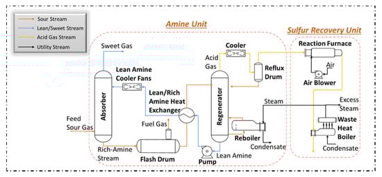 Currently, the most widespread method of removing CO2 from natural gas is the use of alkanolamine solvents in an absorption unit. To be more precise, absorption accounts for 70% of the technologies applied to remove CO2 from natural gas [6]. The amine-based absorption process is illustrated in Figure 1 [7]. Sour gas is first introduced at the bottom of the absorber column at high pressure, while lean amine (amine with low acid gas content) is introduced from the top of the column. The lean amine absorbs the acid gas present in the sour gas as it goes down the column and the treated sour gas (sweet gas) leaves from the top of the unit with very low acid gas content. The solvent, now with high acid content, leaves from the bottom and is subsequently sent to the regenerating unit. In this column, acid gas is removed from the amines at high temperature and low pressure before being recycled back to the absorber. If the acid gas stream has a high amount of H2S (above 20%), it can be further treated in the sulfur recovery unit (SRU) to convert H2S to sulfur.