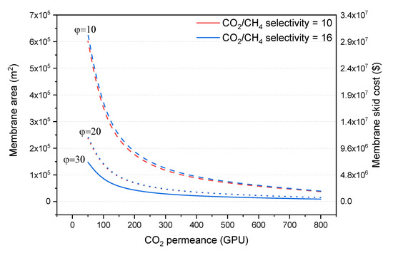 In this work, membranes with a CO2 permeance in the range 50–800 GPU and CO2/CH4 selectivities of 6, 10, 16 and 32, for each of the studied CO2 permeances, are evaluated. The H2S/CO2 selectivity is fixed at 1.2 in all cases.
