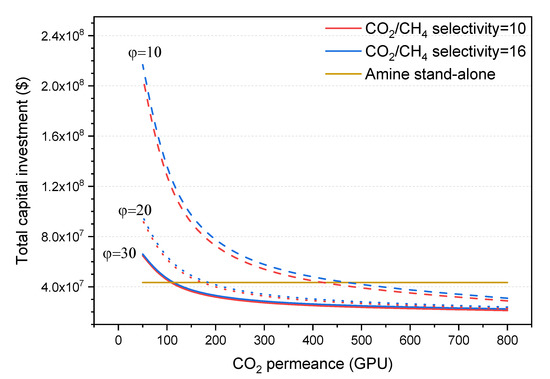 In this section, some important factors are varied to understand their effect on the feasibility of the hybrid process over that of the amine stand-alone. The sensitivity studies were conducted for a membrane performance of CO2 permeance = 200 GPU and CO2/CH4 selectivity = 16, and a pressure ratio of 20. All other factors are fixed unless mentioned otherwise.