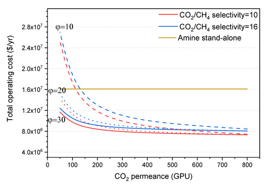 In our work, an economic study is conducted for a hybrid one-stage membrane/amine process (hereafter referred to as “hybrid process”) and compared to a stand-alone amine process at a typical natural gas feed composition. The membrane unit assumed containing a superglassy membrane with a CO2 permeance in the range 50–800 GPU and a CO2/CH4 selectivity between 6 and 32, at three different feed pressures: 900, 600, and 300 psi. The permeate pressure is kept at 30 psi so the pressure ratio values () are 30, 20, and 10, respectively. Recommendations for the required performance of the polymer leading to economic feasibility are provided, so that future research is geared towards the production of MMMs with target long-term CO2 permeance and CO2/CH4 selectivity.