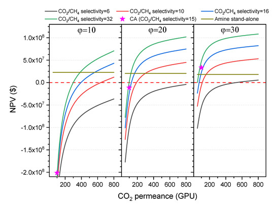 Thus, all three main membrane factors are varied in this section and the NPV values of the hybrid and the amine stand-alone processes are determined and compared. As seen in the graphs in Figure 11, by varying the membrane skid cost between $(200–700)/m2 the NPV value is hugely affected. However, even at the highest estimated price ($700/m2), the hybrid process is more advantageous than the amine stand-alone process.