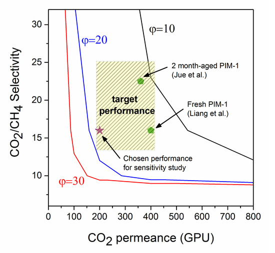 Heavier hydrocarbons are expected to permeate faster than methane. Thomas et al. [48] reported an ethane permeance 2.5 times higher than the methane one in dense PIM-1. Therefore, in this study, the C2H6/CH4 selectivity is assumed at 2.5 while the C3H8/CH4 selectivity has been set at 6.25 (propane permeance 2.5 times higher than ethane permeance). Moreover, the N2 permeance is assumed to be 25% lower than the CH4 one.