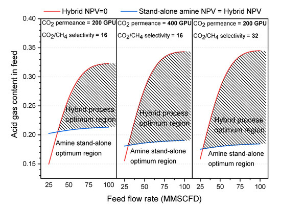 It is worth mentioning that Figure 9 represents a non-optimized process, but the optimization of the membrane unit could further widen the favorable range indicated in Figure 9. The optimization process can involve finding out the optimum percentage of acid gas removal, applying a two-stage process at very high feed acid gas content, or applying counter-current flow instead of crossflow. In addition, the feed pressure and sale gas price are important factors to consider, as discussed earlier. Also, a higher pressure ratio and sale gas price would widen the hybrid process applicable range.