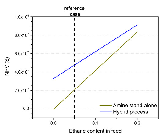 Figure 10 shows the effect of ethane content in the feed side. In all cases, the ethane content has been increased at the expense of reducing the amount of methane in the raw natural gas. As the ethane content in the natural gas increases, so does the NPV for both the hybrid and the amine stand-alone processes due to the higher heating value of ethane as compared to methane, although the gap between these two processes is reduced. Up to 20% of ethane, which is usually the maximum content found in raw gas, the hybrid process has a higher NPV Several approaches can be followed to reduce the effect of high hydrocarbon content in the feed, such as applying a two-stage membrane process with a superglassy membrane in the first unit and a normal glassy membrane in the second unit to recover the hydrocarbon losses.