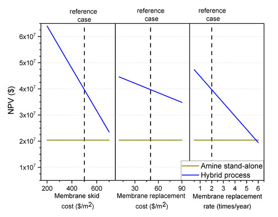 In addition, it was found that the hybrid process is largely sensitive to the membrane skid cost and the membrane replacement rate, which highlights the importance of improving the membranes’ lifespan.