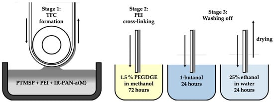 Figure 1 shows the scheme of the fabrication of TFC membranes. The membranes were prepared by the kiss-coating (or meniscus-coating) technique, which is a modified version of the dip-coating procedure. This approach provides one-sided contact between the surface of the porous support and the casting solution. In accordance with the procedure described elsewhere [], coating was performed at room temperature (23 ± 2 °C) using the lab-scale setup, which involves the casting stage with the support transport mechanism (size of the initial support sheet was 0.1 × 1 m). Prior to coating, the support was impregnated with ethanol and then water to prevent the penetration of the polymeric layer into the pores of the MFFK-1 support. The desired speed of the porous support movement was fixed by the speed controller (0.1−0.7 m/min), and the polymer solution was deposited by coating. The casting PTMSP solutions containing 4 wt% PEI (relative to the weight of PTMSP) were prepared by mixing 0.5 wt% solutions of pure polymers in chloroform. In the case of the loaded PTMSP/PEI layer, IR-PAN additives were added to the polymeric casting solution. PTMSP/PEI/IR-PAN casting solutions with different filler contents (10, 20, and 30 wt%) were prepared by mixing 0.5 wt% PTMSP/PEI and IR-PAN solutions in chloroform. The IR-PAN solution was placed in an ultrasonic bath for 15 min before mixing with polymer solutions. The resulting PTMSP/PEI/IR-PAN solutions were stirred with a magnetic stirrer for 15 min and placed in an ultrasonic bath for another 15 min before membrane casting. After the deposition of a thin selective layer on the MFFK-1 support, PEI crosslinking was conducted by immersing the prepared composite membrane for 72 h in a solution of PEGDGE crosslinking agent (4 wt%) in methanol. After that, the membranes were first held in pure 1-butanol for 24 h and then in a 25 wt% solution of ethanol in water for at least 24 h and dried. All TFC membranes prepared in this work are presented in Table 1.