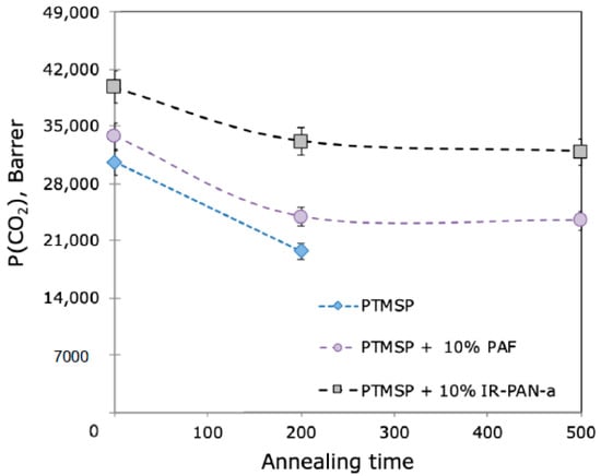 Second, for the hybrid membrane, a smaller relative decrease in gas permeation was observed after the first 200 h of annealing compared to the PTMSP membrane without IR-PAN-a additives. More importantly, the following 300 h of annealing practically did not change the transport properties of the hybrid dense PTMSP + 10 wt% IR-PAN-a membrane with a thickness of 38 µm.