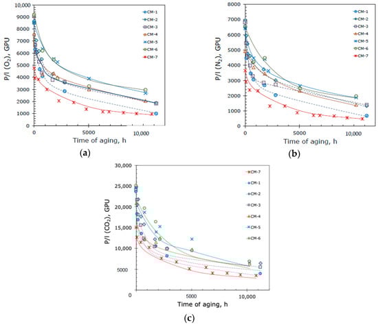 The change in CO2 gas permeance of the investigated composite membranes with time is shown in Figure 6. The permeance of the IR-PAN-a-loaded crosslinked membranes (for example, for CM-1–CM-6 P/l(CO2) = 21,000–25,000 GPU) significantly exceeds the permeance of the crosslinked composite PTMSP membrane (CM-7: P/l(CO2) = 15,000 GPU). The positive effect of IR-PAN as an additive can also be demonstrated by the reduction of the PTMSP aging; all IR-PAN-a-loaded samples of composite membranes (CM-1–CM-6) had higher gas permeance after 11,000 h of aging compared to a composite membrane with a selective layer of pure crosslinked PTMSP (CM-7). It is important to emphasize that the ideal gas selectivities of the PTMSP/IR-PAN composite membranes for CO2/N2 and O2/N2 were 3.5–4.0 and 1.3–1.5, lower than those of dense membranes for the same gas pairs: 5.2–5.8 and 1.4–1.5 (Table 2). This behavior is typical for the transport properties of TFC membranes and confirms the absence of defects in the thin selective layer of hybrid membranes. The results confirm that IR-PAN, as well as metal–organic frameworks and PAFs, stabilizes the gas transport properties of composite membranes with a thin selective PTMSP layer.