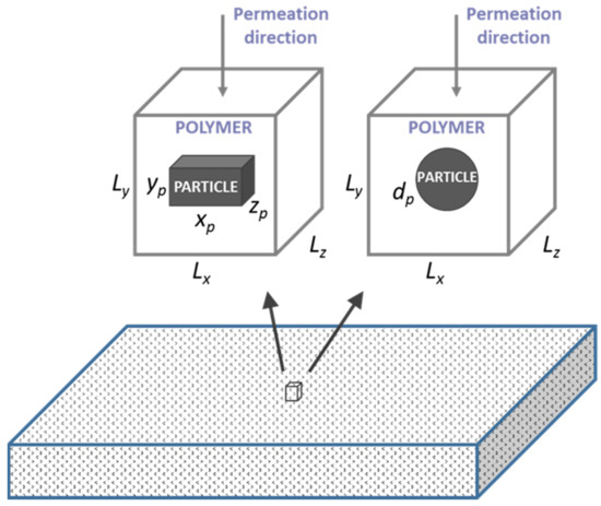 A schematic diagram of a MMM is shown in Figure 1. It is assumed that the nanoparticles are uniformly distributed throughout the whole membrane, such that it is possible to define an elementary cubic unit comprised of a single nanoparticle located at the center of the polymer cube. The membrane, therefore, consists of multiple identical elementary units juxtaposed to form the complete membrane. It can be easily shown that the permeability of a permeating species is identical for both a single elementary unit and the whole membrane [20,21]. Consequently, to estimate the permeability of the entire MMM membrane, it is sufficient to solve Fick’s second law of diffusion numerically for a single elementary unit. In this investigation, the polymer phase was assumed to be isotropic, and the nanoparticle was located at the center of an elementary unit was assumed impermeable to the permeating gas. Two different types of impermeable nanoparticles often suggested as fillers in barrier films were used in this investigation. These were spherical and cuboid nanoparticles. An example of the former is TiO2 nanoparticles, and an example of the latter is montmorillonite (MMT) clay nanoparticles. The dimensions of each cubic elementary unit were Lx, Ly, and Lz (Figure 1), whereas the spherical nanoparticle was defined with its diameter dp, and the cuboid nanoparticle dimensions were xp, yp, and zp.
