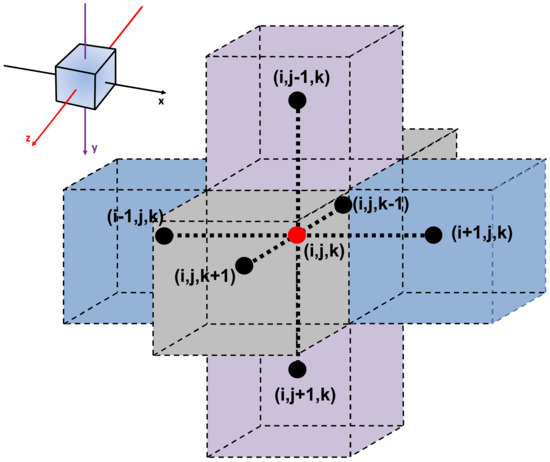 Nomenclature of an interior mesh point with its six neighboring mesh points. x, y, and z directions are represented by i, j, and k, respectively.