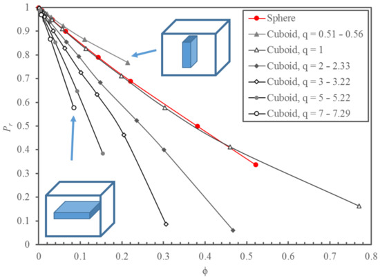 Figure 3 presents the relative permeability of MMMs obtained from the simulated permeation experiments with spherical nanoparticles for a filler volume fraction ranging from 0 to 0.52 and with cuboid nanoparticles for a ranging from 0 to 0.77. Since q has a significant impact on Pr, the results for the cuboid nanoparticles were grouped over a series of narrow ranges of the aspect ratio: from 0.51–0.56 to 7.00–7.29. Many more numerical results were obtained than those presented in Figure 3, and they will all be used in developing a model to predict Pr. When q is large, the cuboid nanoparticle is a thin flat sheet with a large projected area. The migrating species must circumvent to reach the permeate side of the membrane, thereby reducing the permeability of the membrane. On the other hand, when q is small, the cuboid has a small projected area with a large thickness (yp).