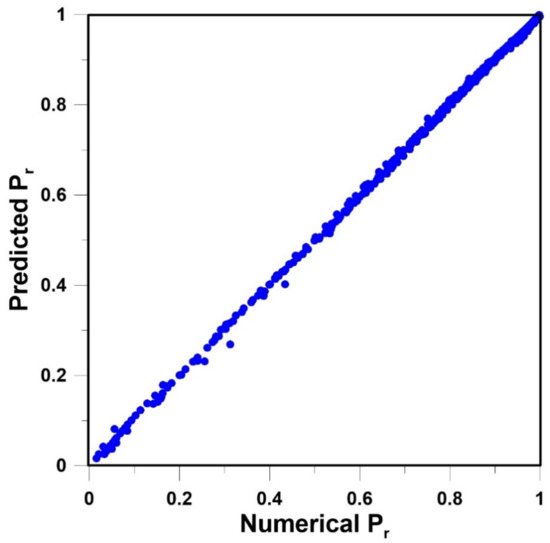 Various input data vectors were explored in order to find the simplest neural network structure to accurately predict Pr. The two simplest structures of the FFNN were the ones that used only the relative dimensions of the nanoparticles within an elementary unit. In one case, the three relative lengths, xp/Lx, yp/Ly and zp/Lz, were used. In the other case, the relative projected area (xpzp/LxLz) and the relative thickness (yp/Ly) as shown in Figure 5, were used. To determine the neural model for the prediction of Pr, 359 data points obtained by solving numerically the governing partial differential equation were divided equally into a training and a validation data set. The quasi-Newton nonlinear regression algorithm was used to adjust the weights of the FFNN that minimize the sum of squares of the training data set. At each iteration, the sum of squares of the validation data set was also evaluated, and the set of weights that minimize the sum of squares of the validation data set was retained. The coefficient of regression for the FFNN with six hidden neurons (including the bias) was 0.9998 for both neural network structures mentioned above. The parity plot based on the FFNN of Figure 5 is presented in Figure 6.