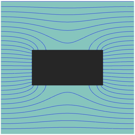 The steady-state isoconcentration lines of the migrating species on the half-cut plane of an elementary unit of a MMM with a cuboid nanoparticle with an aspect ratio q = 2.07 and a relative thickness yp/Ly = 0.25.
