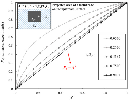 Considering the dependence of the local permeation flux on the size of the permeation channel for a given y-position, a dimensionless parameter A*, defined in Equation (32), was introduced. This dimensionless parameter was simply the ratio of the projected area that is available for diffusion (LxLz − xpzp) and the maximum surface area for diffusion (LxLz). It is logical to postulate that an increase in A* will lead to an increase in Pr of the MMM, and vice versa. Figure 8 clearly shows the strong relationship between Pr of a MMM with cuboid nanoparticles and the dimensionless parameter A*.