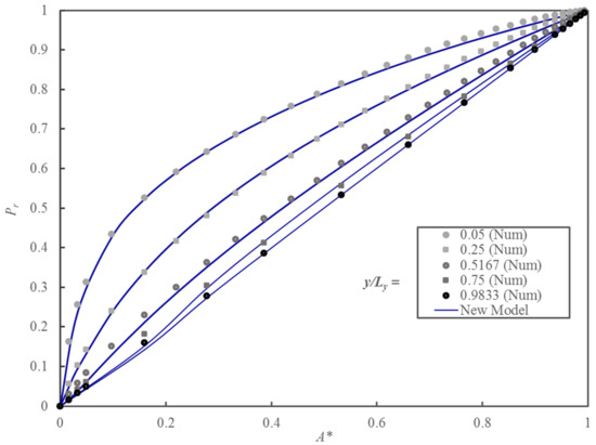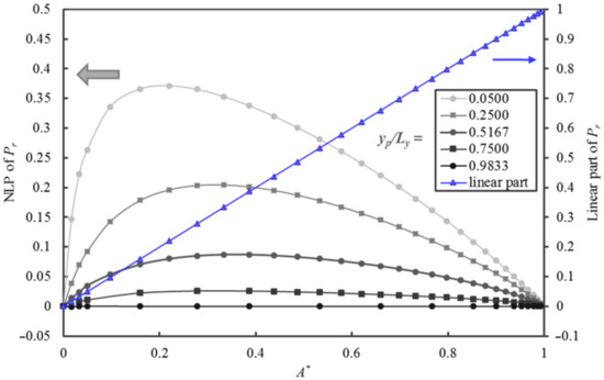 To characterize and better understand the contribution of the nonlinear portion (NLP) of the relative permeability curve, Figure 9 is presented to highlight the breakdown of Pr in Figure 8 into its linear (Pr = A*) and NLP as a function of A*. This data exploration is essential in searching for the right form of the analytical equation in the development of an accurate predictive model. The contribution of the NLP that is related to yp/Ly is clearly illustrated in Figure 9. The nonlinear term first increases rapidly with A* up to a maximum value before decreasing more gently to zero as A* tends to unity. The location and the magnitude of the maximum are a function of the relative thickness yp/Ly. The maximum value is located in the interval of A* between 0.16 to 0.38. The contribution of the nonlinear part can be as high as 0.37 of the value of Pr at yp/Ly = 0.05 and A* = 0.18.
