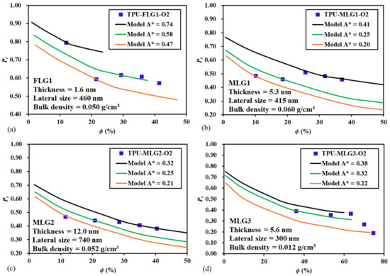 To validate the proposed model for the prediction of the relative permeability of MMMs with elongated impermeable nanoparticles, the data of a recent paper published by Zahid et al. [25] was used. This paper reports an investigation on the effect of the morphology of four types of layered graphene flakes, used as fillers, on the gas barrier properties of thermoplastic polyurethane (TPU) films. Fortunately, this paper provides the geometrical parameters of the nanofillers and the experimental permeability data for the oxygen transport across polyurethane films. The digitalized permeability data were converted into relative permeability data using Equation (1). Results in their paper were presented in terms of the mass fraction of the fillers such that, using the bulk density of the four types of layered graphene flake powders provided in their paper and a density of 1.08 g/cm3 [26] for the specific thermoplastic polyurethane used, the filler volume fraction was calculated. A void fraction of the nanofiller powder flakes of 0.38 [27] was used in the conversion from mass fraction to volume fraction. The comparison of the experimental relative permeability Pr obtained by Zahid et al. [25] and the Pr predicted by the proposed model is presented in Figure 11. The geometrical parameters A* and yp/Ly depend on the spacing between the particles for fixed particle dimensions; however, this information was not provided by Zahid et al. [25]. Therefore, for each set of experimental results, three values of A* were used in the model to obtain reasonable estimations. Correspondingly, yp/Ly was decreased for an increase of A* to maintain constant the filler volume fraction ϕ. Results show that the experimental data fall among the predicted Pr curves for the three values of A*. The proposed model assumed ideal MMMs whereas, in an actual membrane, the dimensions, orientation, and spatial distribution may show significant variability. Despite these potential discrepancies, the comparison of Figure 11 shows that the model can adequately represent the relative permeability of the four types of MMMs presented in the paper of Zahid et al. [25].