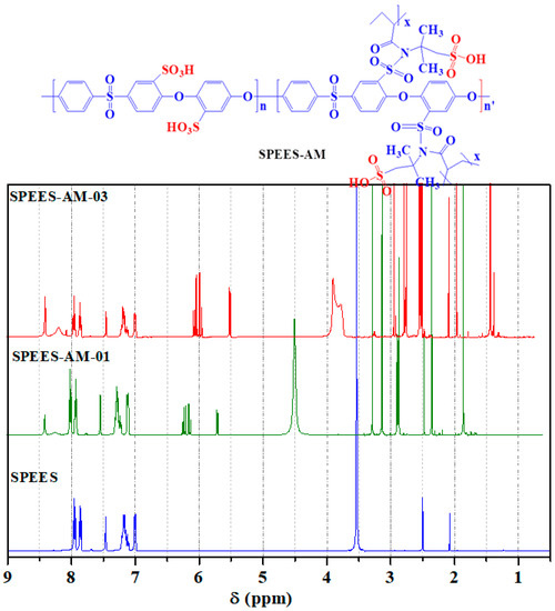 1 H NMR for SPEES, SPEES-AM-01, and SPEES-AM-03.