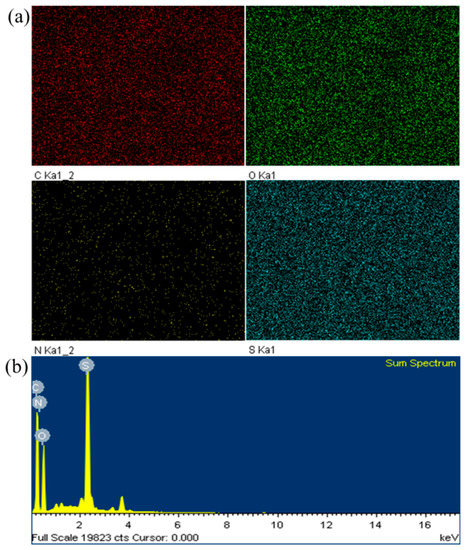 (a) Elemental mapping images for C, O, N, and S; and (b) EDS spectrum of SPEES-AM-02.