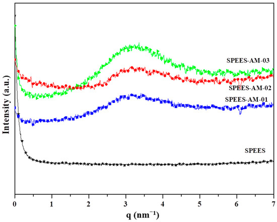 SAXS measurements employed for the micro-phase separation of SPEES and SPEES-AMs. Since the location of the SAXS peak is related to the inter-cluster distance, the average dimension of the ionic clusters in the membranes, which constitute the ionic paths for proton migration in the PEMFCs, can be deduced from the SAXS data [7]. Figure 6 shows the SAXS patterns of the plain SPEES membrane and the SPEES-AM membranes. The average dimension of ionic clusters is calculated with the given Equation (4):