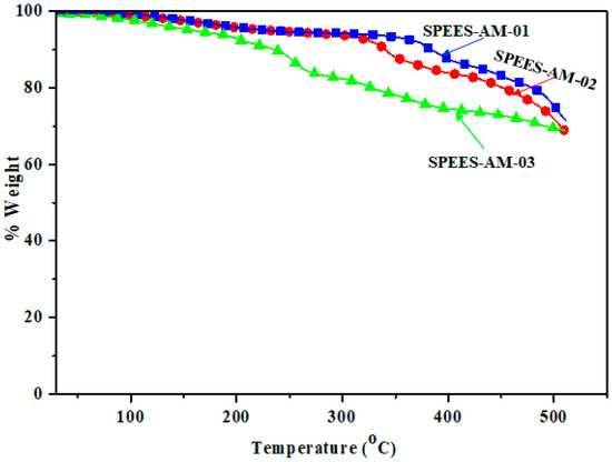 Thermal analysis of the prepared membranes showed three-step weight losses in the temperature range between 30 °C and 500 °C in Figure 7. All membranes were quite stable up to 100 °C. Beyond 100 °C, the first weight loss was observed by the evaporation of bound water in the membrane via ionic charge of –SO3H. SPEES-AM-03 showed the maximum weight loss in this region because of the presence of more bound water associated with more functional groups in it. The second weight loss was observed around 200–350 °C because of the decomposition of the sulfonic acid groups in SPEES-AM membranes. Weight loss up to 350 °C for the SPEES-AM-03 membrane was appreciably higher than those for the SPEES-AM-01 and SPEES-AM-02 membrane because more sulfonic acid groups were present inside it. The third weight loss step was attributed to the decomposition of the polymer backbone around 350 °C in SPEES-AM membranes.