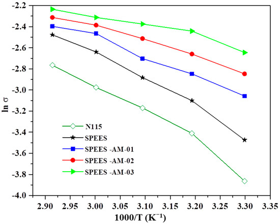 Arrhenius plot of Nafion (N115), SPEES and SPEES-AMs.