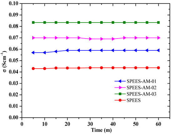 The proton conductivity is also checked at constant temperature (45 °C) after acid stability up to an hour in Figure 11 and all membranes observed that the conductivity is also constant. We have seen that all membranes perform well and there is no one membrane that loses its conductivity property. Therefore, SPEES-AMs are completely sufficient for fuel cell operations at low temperature with low RH. Continuity is not seen beyond 65 °C conductivity and has little fluctuation and also affects the backbone of the membrane. The water uptake of SPEES-AM membranes upward with the increasing AMPS content, which loosens the compact structure of membrane, and therefore some sulfonic acid groups leach into the water during the measurement. It should be mentioned that none of the membranes were broken into small pieces, and all samples remained in a good membrane form after the 120 h test period.