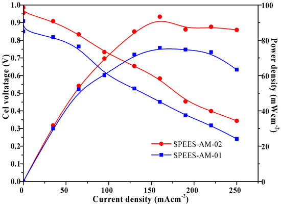 The H2/O2 fuel cell performance of SPEES-AM membranes is shown in Figure 12. As shown in Figure 12 SPEES-AM-01 and SPEES-AM-02 exhibited the open-circuit voltage (OCV) of 0.90 V and 0.98 V respectively. The fuel cell performance has been tested at 50 °C under 15% RH. This research will create a new achievement fuel cell operation at low temperature with RH and utilization of water molecule generated at the cathode section. SPEES-AM-02 showed a maximum power density of 92 mWcm−2 at a current density of 159 mA cm−2, while SPEES-AM-01 showed a peak power density of 75 mWcm−2. Therefore, it seems that the fuel cell operation at low temperature can facilitate operation and energy in order to reduce the energy consumption and can facilitate in the field of energy.