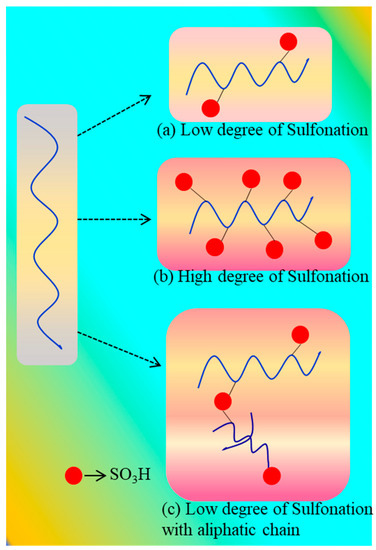 Schematic illustration of sulfonation of PEES (a) low degree of sulfonation (b) high degree of sulfonation and (c) low degre of sulfonation with apliphatic monomer.
