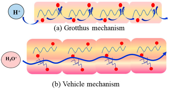 Proton transfer mechanism in SPEES and SPEES-AM membranes: (a) Grotthus mechanism (b) vehicle mechanism.