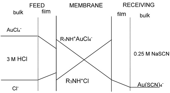 The transport of gold(III) across the membrane containing the ionic liquid phase is described by applying Fick’s first diffusion law to the diffusion layer at the feed phase side, to the membrane phase, and to the receiving phase, though this last contribution is often negligible compared with that at the feed phase side since the distribution coefficient of Au(III) between the membrane and the receiving phases uses to be much lower than the value between the feed and the membrane phases. Figure 2 shows a probable transport scheme for Au(III) with the ionic liquid (R3NH+Cl−) dissolved in toluene through a supported liquid membrane. Accordingly, the transport of Au(III) is associated with a mechanism of co-transport, being the driving force of the difference in acidity between the feed and receiving phases.